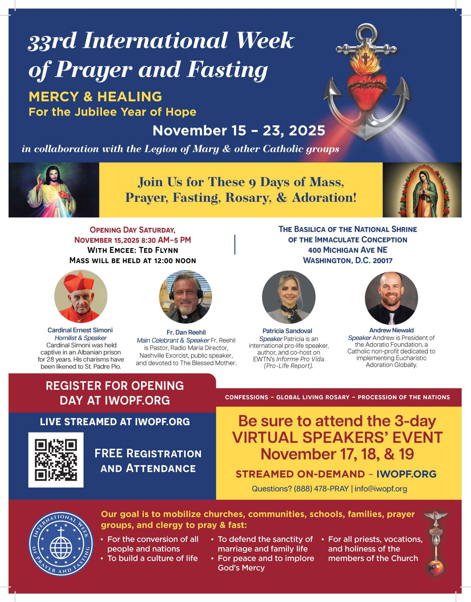The 33rd International Week of Prayer and Fasting coalition, in collaboration with the Legion of Mary, Marian Fathers, Defend Life, and others are asking members of parishes to unite for nine days of prayer and fasting from November 15 – 23, 2025.